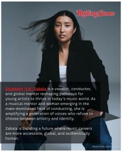 BOSTON, MA, UNITED STATES, March 13, 2026 /EINPresswire.com/ -- In a Rolling Stone MENA feature, Elizabeth "Liz" Zabala was named among five entrepreneurs redefining success in 2026, recognizing her as a vocalist, conductor, and global mentor reshaping pathways for young artists in today's music world. The feature highlights leaders whose work reflects a shift toward purpose-driven, people-focused approaches to building a business.The article describes Liz as a “woman emerging in the male-dominated field of conducting” who is "amplifying a generation of voices who refuse to choose between artistry and identity." It highlighted her international coaching program, which works with students from Singapore, Taiwan, Los Angeles, New York, and beyond, preparing them for competitive auditions and guiding them toward sustainable music careers.